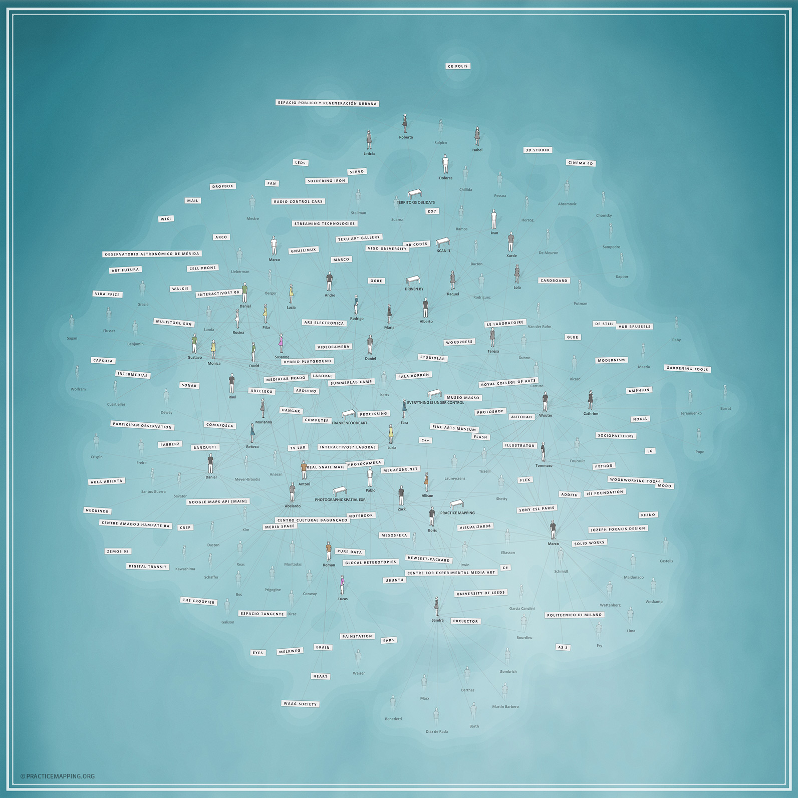 This visualization includes as entities all persons in the semantic network, all organizations, projects and tools. The relations are drawn when there is a relation in the semantic network or when a physical proximity was detected when the map was generated. [Developed by Marco Quaggiotto]