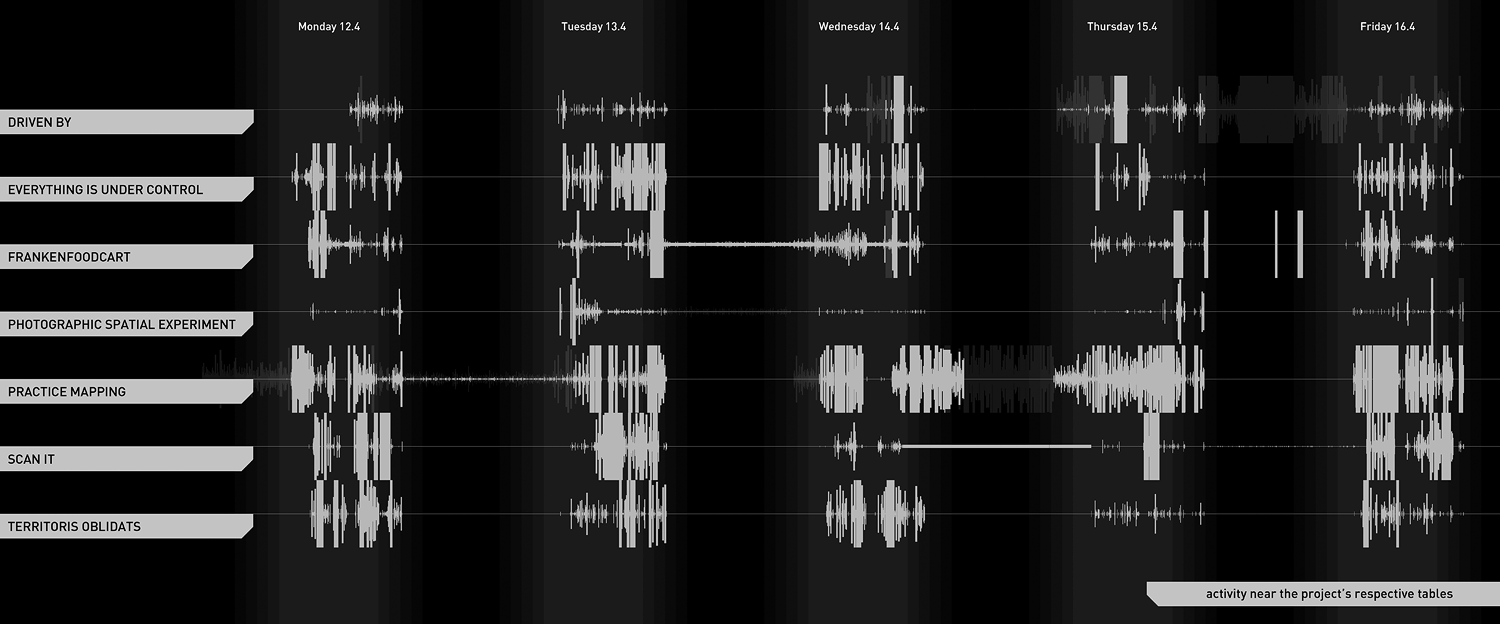 The second map aims to provide an overview of the level of activity of each project over time. This activity is measured in terms of the amount of physical proximity detection events per time unit in the proximity of the workspace table/area assigned to the respective projects.