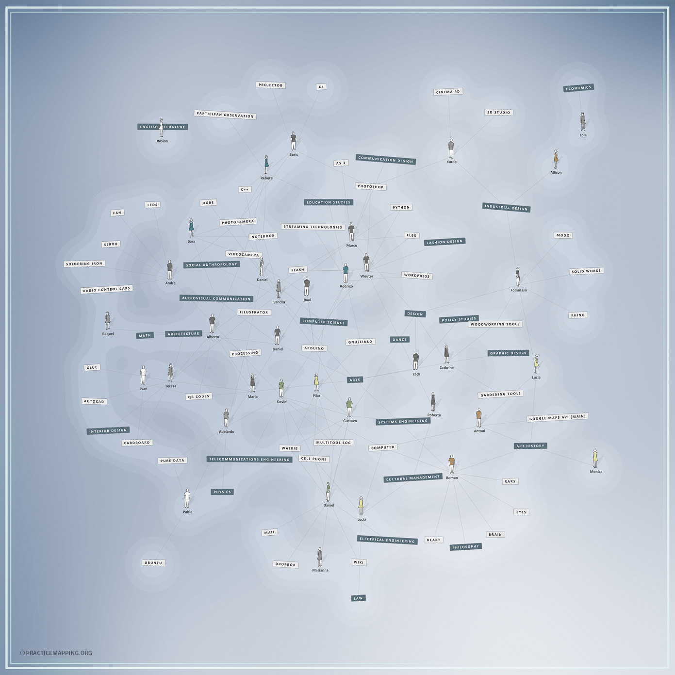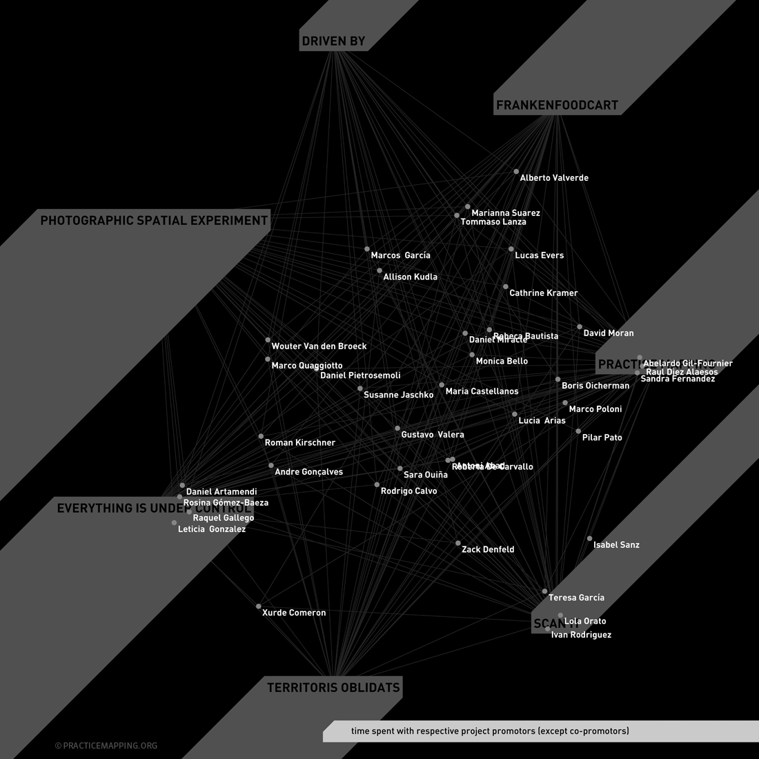 The project proposed to collect data on these interactions in a structured manner, and to use scientific analysis techniques to detect patterns and structure in the collected data. The resulting annotated network data should then serve as source data for the computationally generated visualizations, both dynamic and static, which are to form a visual narrative, part cartographic, part tomographic, making visible certain aspects of the interaction dynamics of the investigated creative practice.